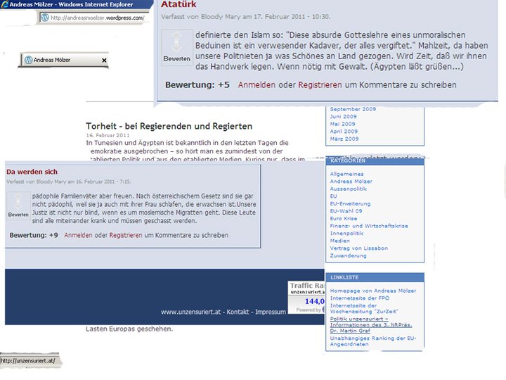 „Migratten“ wurde nicht auf einer Website von Anonymen, von denen nichts anderes zu erwarten ist, gelesen, sondern auf der Website „Politik unzensuriert – Informationen des 3. NRPräs. Dr. Martin Graf“, „Migratten“ wurde also gelesen auf einer Website, deren Autoren auch gewählte Abgeordnete sind: Andreas Mölzer, Norbert Hofer, Werner Neubauer, Walter Rosenkranz und eben Martin Graf.