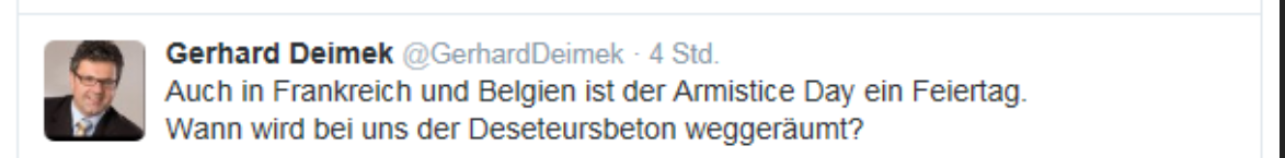Es war zwar das Schweigen von Gerhard Deimek, NR der identitären Gemein-Schaft, bereits recht vielsagend, seine Antwort nun ist … Alles, was einem NR der identitären Gemein-Schaft zu den blutrünstigen Grauslichkeiten in einem seiner Gesinnung nahestehenden Medium¹ einfällt, ist die „Staatsgage“. Geld, Geld, Geld*, an das denken freiheitliche Mandatare und Mandatarinnen also unentwegt, ihre „Staatsgage“ wollen sie nicht teilen, die Angst muß hoch sein, es könnte für sie zu wenig bleiben von dem Steuergeld, über das sie wohl gänzlich verfügen möchten, um es nach ihrem Rechtdünken veteilen zu können, wohl nur mehr an Schönwahrgutschaffende ihrer Gesinnung³ …