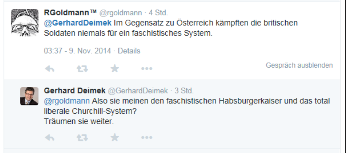 Aber NR Gerhard Deimek wurde nach keiner „Staatsgage“ gefragt, es wurde ihm auch kein „Machwerk“ vorgelegt, mit dem um eine „Staatsgage“ angesucht wurde. Das wäre auch vollkommen absurd, ihn danach zu fragen. Und vor allem fern jedweder Wirklichkeit, jedweder Intention, vom Staat je Geld erhalten zu wollen. So ist nur eines vollkommen absurd und vollkommen fern jedweder Wahrheit und Wirklichkeit, die Antwort von NR Gerhard Deimek. Wenn NR Gerhard Deimek allerdings mit den „Machwerken“ die Collagen meint, so qualifiziert er selbst seine eigenen Aussagen als „Machwerke“, denn die Collagen sind nicht anderes als zusammengestellte Screenprints als Belege – auch seiner Aussagen. Aber diese seine absurde und wirklichkeitsferne Antwort, und darauf kommt es an, stellt wieder einmal klar, wie verantwortungslos die identitäte Gemein-Schaft ist, wie wenig sie gewillt ist, den geringsten Beitrag zur Entbrutalisierung beizutragen, wie im ethischen und moralischen Sinn sie kriminell agiert durch das Verbreitenlassen, durch das Stehenlassen von blutrünstigsten Phantasien.