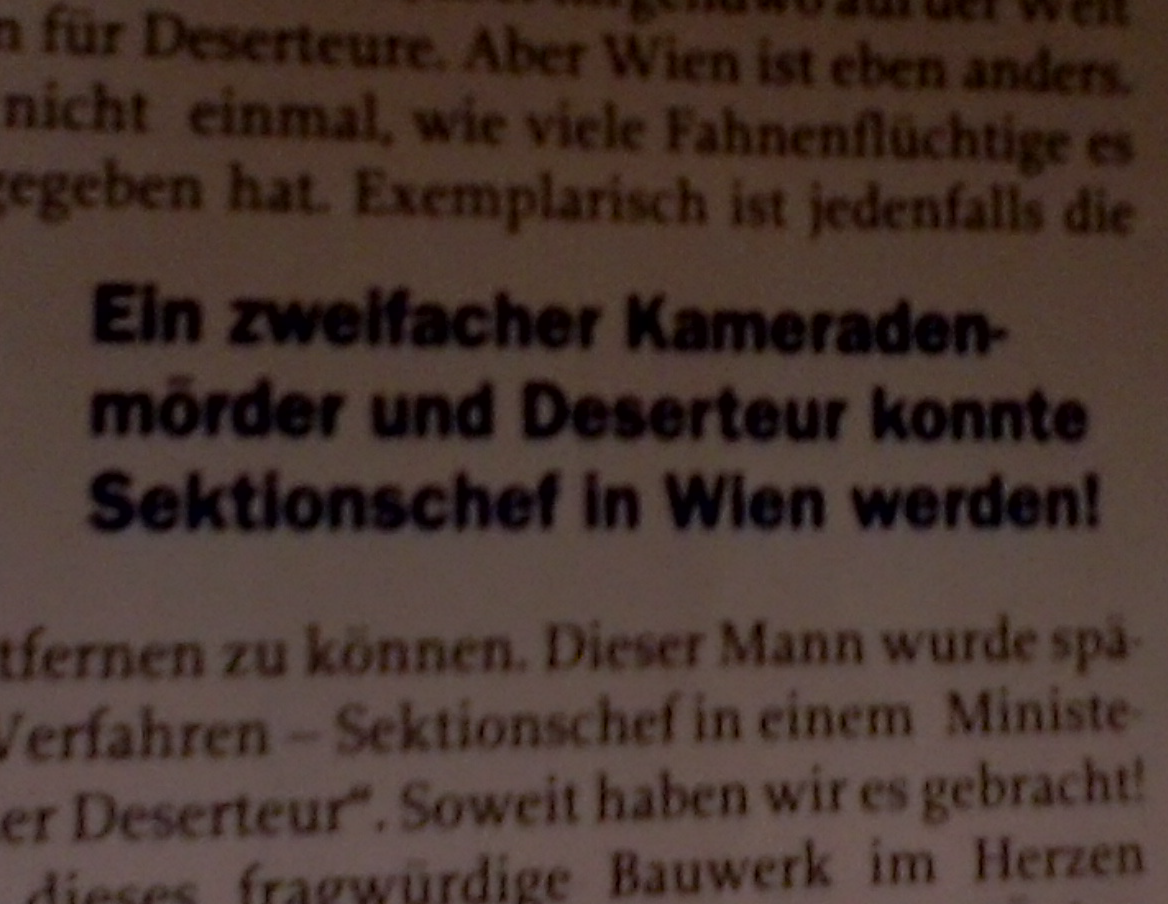 eröffnete, was also für NR Deimek in der Zeit von 1938 bis 1945 in Österreich für ein „System“ herrschte oder wer herrschte, dazu äußert er sich nicht. Wie er die herrschende Partei in dieser Zeit einstuft, darüber gibt er keine Auskunft. Es könnten darüber Vermutungen angestellt werden. Aber es soll nicht spekuliert werden. Gesichert jedenfalls ist eines, für NR Deimek gab es zwischen 1938 bis 1945 kein „faschistisches System“, denn sonst könnte ihm eine derartige Frage gar nicht einfallen. Wenn es um das Denkmal für Verfolgte der NS-Militärjustiz geht. Und um dieses ist es in diesen Postings vom 9. November 2014 gegangen. Das Denkmal, das von NR Deimek „Deserteursbeton“ genannt wird, und zu diesem Denkmal fällt NR Deimek gleich noch eine Frage ein: „Wann wird bei uns der Deserteursbeton weggeräumt?“