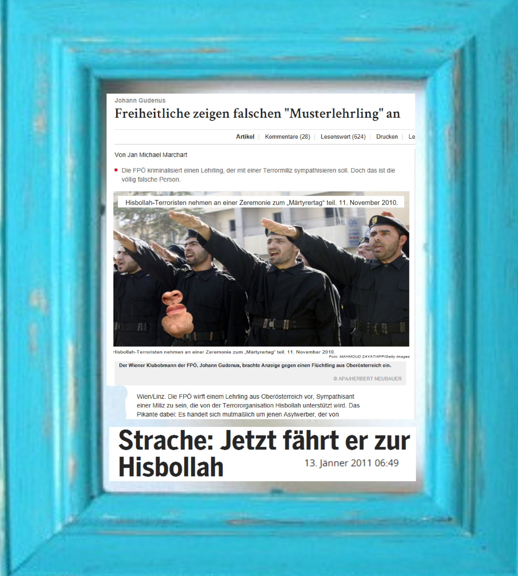 NS Weil es bei dem Um-sich-Schlagen der FPÖ gegen einen jungen Menschen um die Organisation Hisbollah geht, um es ein wenig heiter ausklingen zu lassen. Der zurzeitige Vizekanzler will, wurde am 13. Jänner 11 in Österreich berichtet, zur Hisbollah … Kurz davor, am 11. November 10, nehmen, wie in der Collage festgehalten, fesch aufgereihte Hisbollah-Männer an einer Zeremonie „Märtyrertag“ teil — ja, da kann doch ein jeder Mensch nur hinfahren wollen …