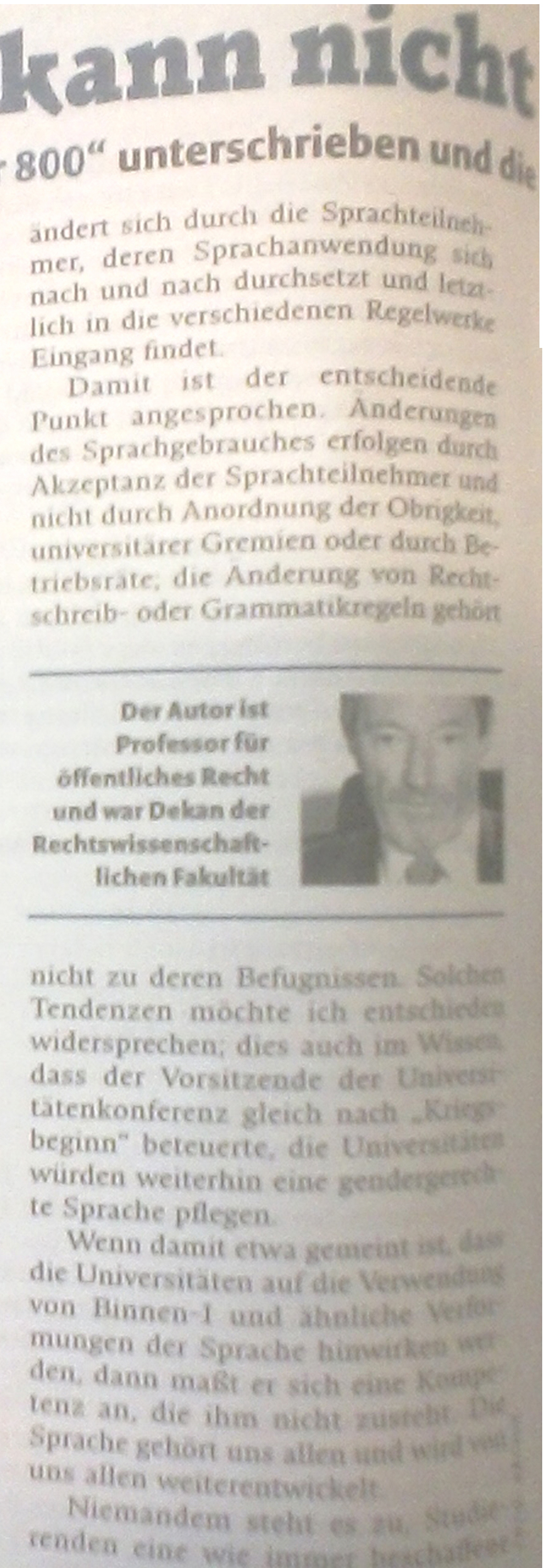 Aber sein Mitläufertum versucht er nachträglich in der dieswöchigen Ausgabe der Stadtzeitung „Falter“ mit einem Artikel zu rechtfertigen, er versucht, sich als einen Mann darzustellen, der diffferenziert zu denken imstande ist, aber auf eine Art, die entgegen seiner Intention, die Notwendigkeit der Binnen-I-Schreibung eindrücklich bestätigt …