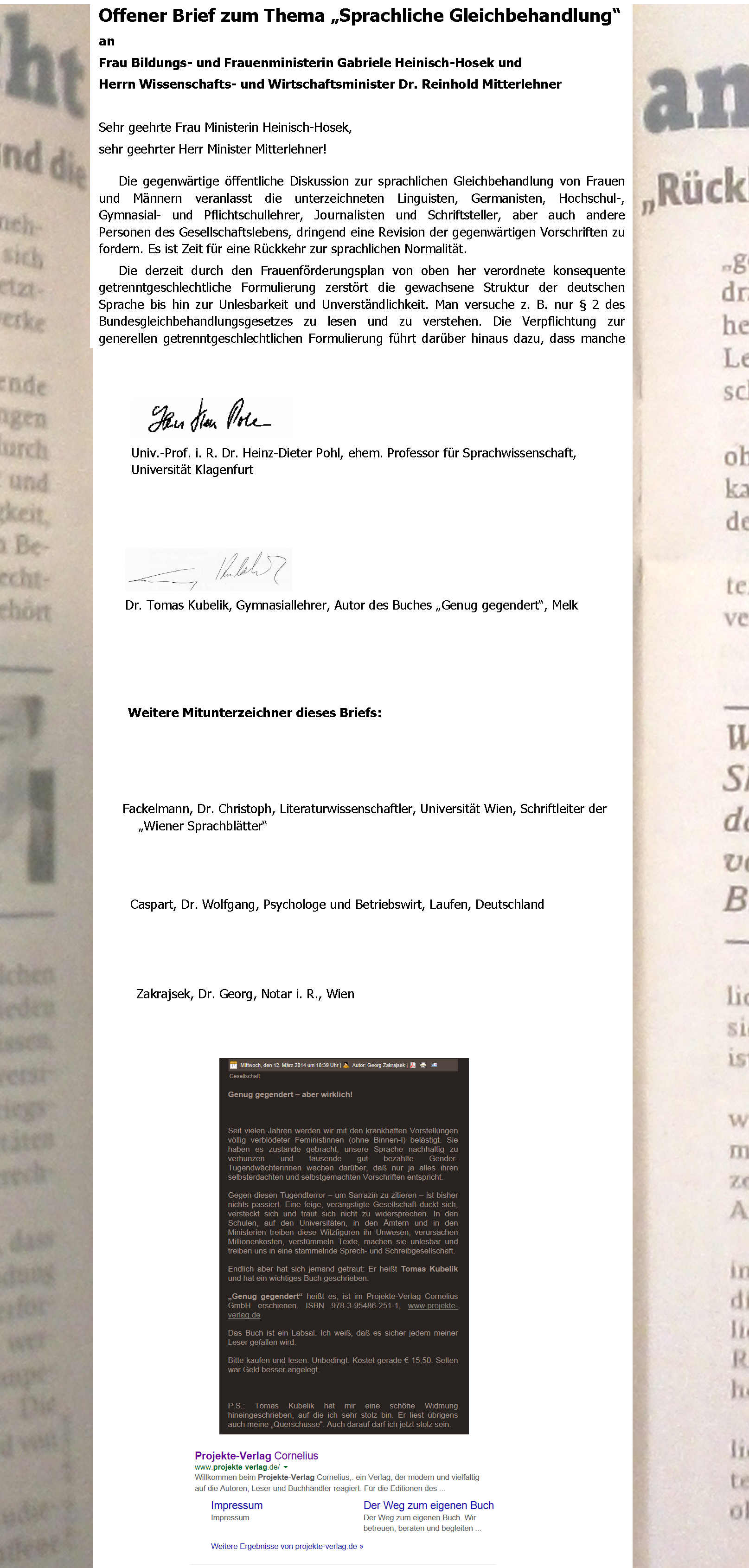 Wie viele Medien in Österreich – wer kann diese noch zählen – schreiben im Zusammenhang mit diesem Brief, 800 Sprachkritiker … In Österreich sind also Pensionisten, Studentinnen, Hausfrauen u.a.m. Sprachkritiker – und alle so brillant wie Hauptunterzeichner Thomas Kubelik, dessen Selbstbezahlbuch leicht beschrieben werden kann. Es ist ein Buch, in das alles hineingestopft wurde, was nur hineingestopft werden kann, alles wird vermischt; ein Auszug als Beispiel wurde in die Collage aufgenommen. Autoren und Autorinnen der Nationalismus- und Revisionismus-Industrie pflegen mit Vorliebe diesen Stil der inhaltlichen Unkonzentriertheit, der Überwucherung, der Vermischung …