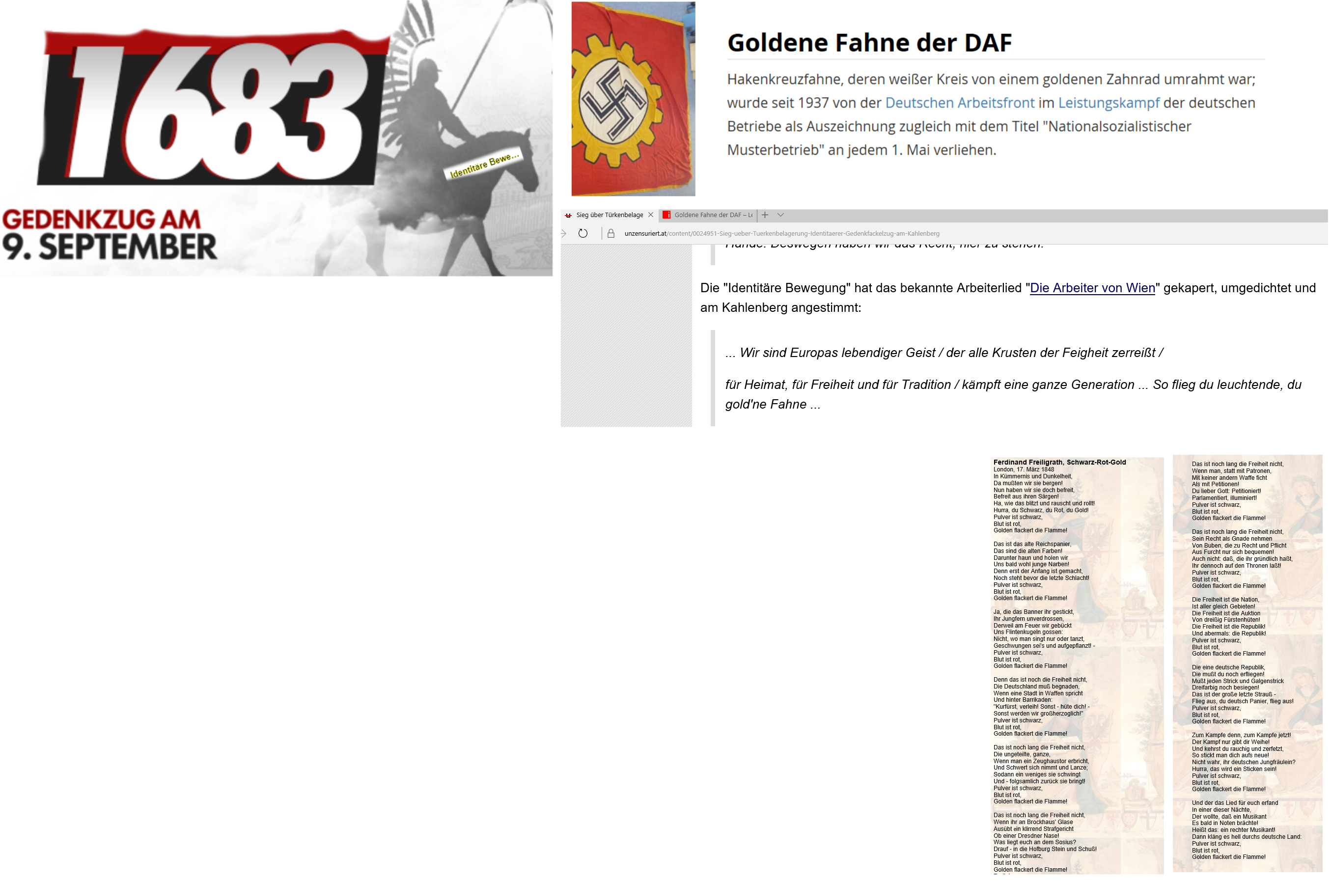 Freilich werden die identitären Musterbuben und Mustermädchen sagen, das habe gar nichts mit … Als sie das Lied „Die Arbeiter von Wien“ um…, da dachten sie freilich nicht an die „goldene Fahne“ der „DAF“, mit der die „deutschen Arbeiter“ … Freilich dachten sie, das ihnen, wie ausgeführt, im Grunde verwehrt ist, an Freiligath vielleicht und sein Bedichten von „Schwarz-Rot-Gold“ … Und schon werden sie meinen, damit entlastet zu sein. Aber bereits die erste Zeile dieses Fahnengedichts offenbart alles, was von einer solchen Gesinnung —