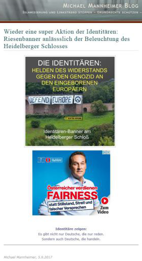 Es ist Gesinnungsdienst, daß Michael Mannheimer direkt unter seinem überschwenglichen Lob für eine identitäre Aktion für die identitäre Parlamentspartei wirbt.