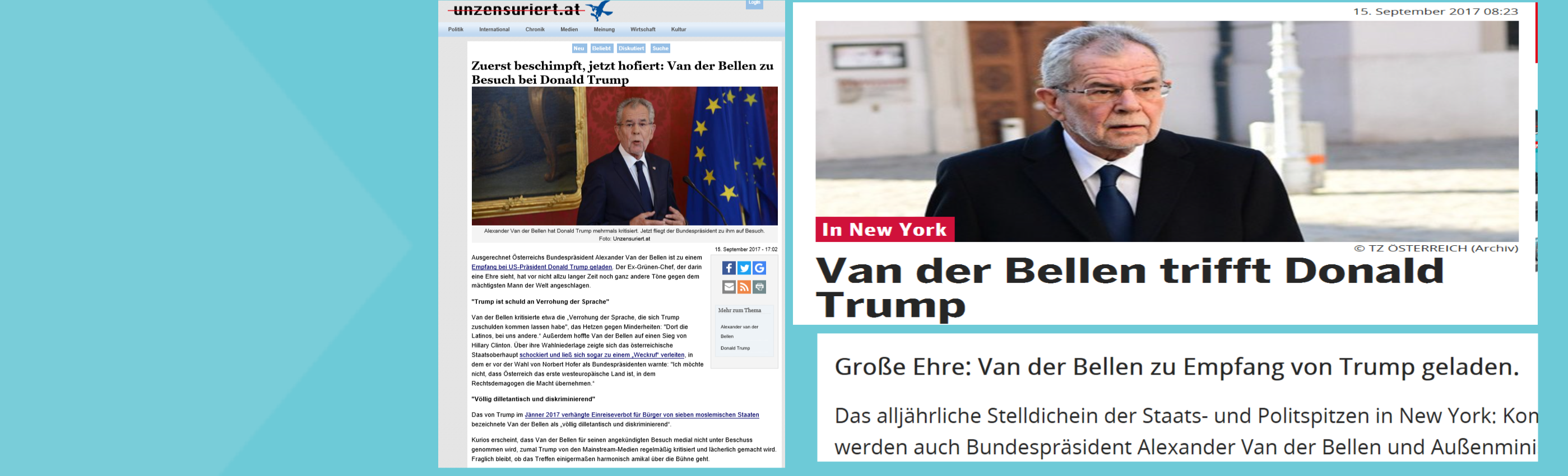 Es ist eine Meldung aus einer Umsonst – ihr liederlicher Umgang mit Nachrichten ist bekannt –, aus der nicht eindeutig hervorgeht, ob Alexander Van der Bellen zum Empfang von Donald und Melania Trump, es sagte, es sei ihm diese Einladung eine „große Ehre“ …