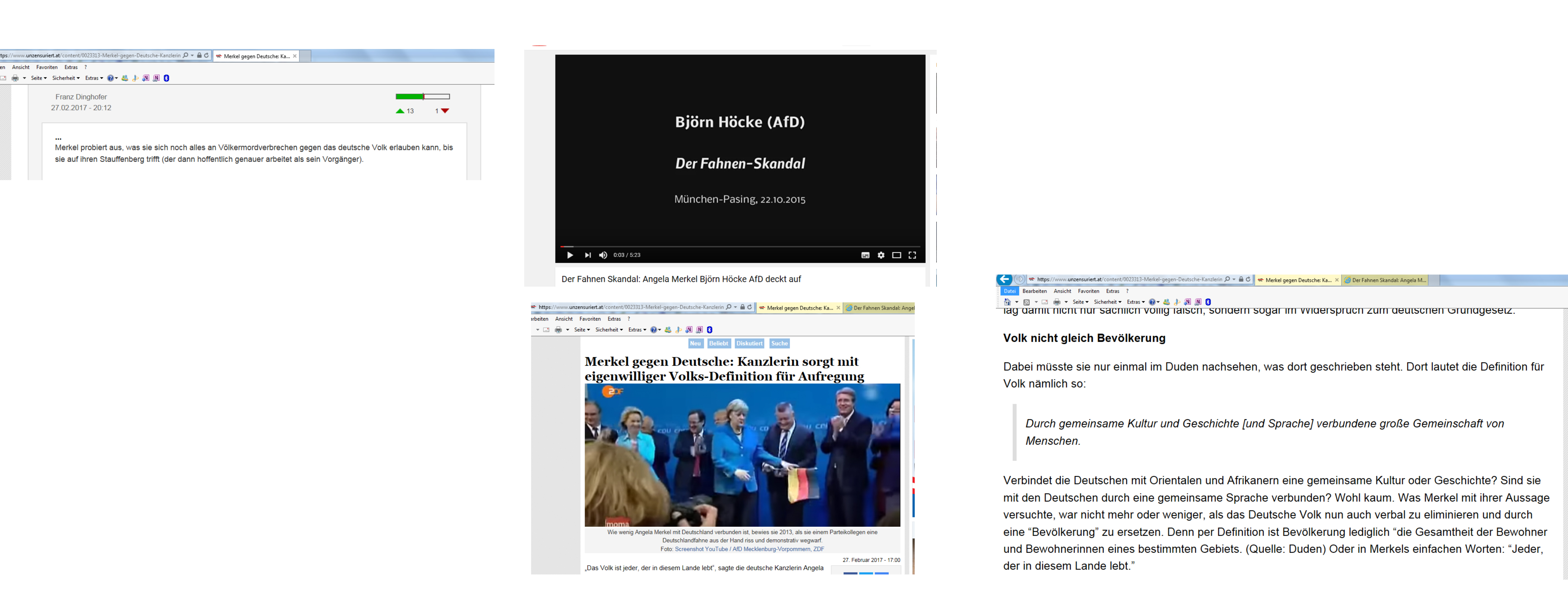 Wie in der Collage gelesen werden kann, veröffentlicht die Copysite der identitären Parlamentspartei, die sich auch bald um Presseförderung anstellen könnte, ein Bild mit der Unterstellung: „einem Parteikollegen eine Deutschlandfahne aus der Hand riss und demonstrativ wegwarf.“ Es ist wahr, daß Angela Merkel die Fahne abnahm, aber von einem Wegwerfen kann nicht gesprochen werden. Und wen ruft die Copysite der identitären Parlamentspartei dafür als Kronzeugen auf? Mit einer Verlinkung zu dem Video? Es ist Björn Höcke.