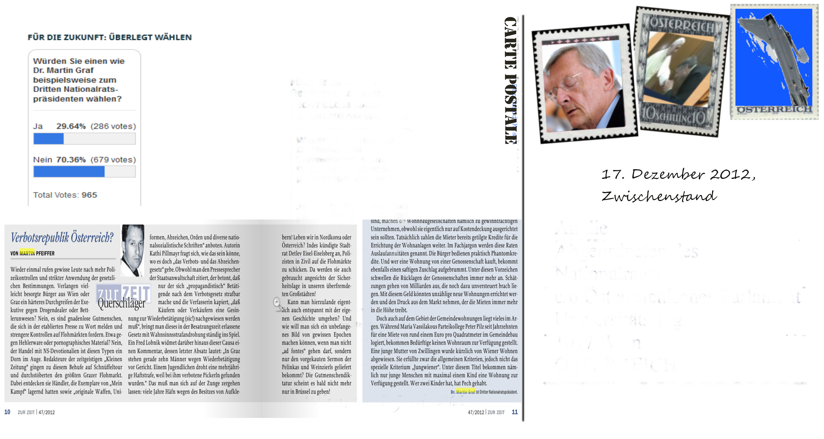Für Ober-ZZ-Leiter Andreas Mölzer ist der Dezember 2012 also ein rechter Geschenkemonat … Das große goldene Verdienstzeichen des Landes Kärnten lehnte er nicht als „Sitzfleischorden“ ab, wie im Februar 2012 das große silberne Ehrenzeichen der Republik Österreich -, freilich in Kärnten ist keine Solidarität mit dem zurzeitigen Obmann der Freiheitlichen notwendig, denn in Kärnten würde der zurzeitige Obmann der Freiheitlichen jedweden Orden der Karawankenwelt ohne Anstand sofort bekommen. Und nun gegen Ende des Monats auch noch ein „eindrucksvolles Gemälde“ von Odin Wiesinger, überreicht vom zurzeitigen Obmann der Freiheitlichen … Was auf diesem „eindrucksvollen Gemälde“ abgebildet ist, kann nicht gesagt werden, denn, wie zu sehen ist, es ist verpackt, nicht von Christo, aber vielleicht von Andreas Laun, der in dieser Ausgabe 51-52/2012 der freiheitlichen ZZ ebenfalls schreibt, und Andreas Laun schreibt so „eindrucksvoll“ als Odin Wiesinger malt …