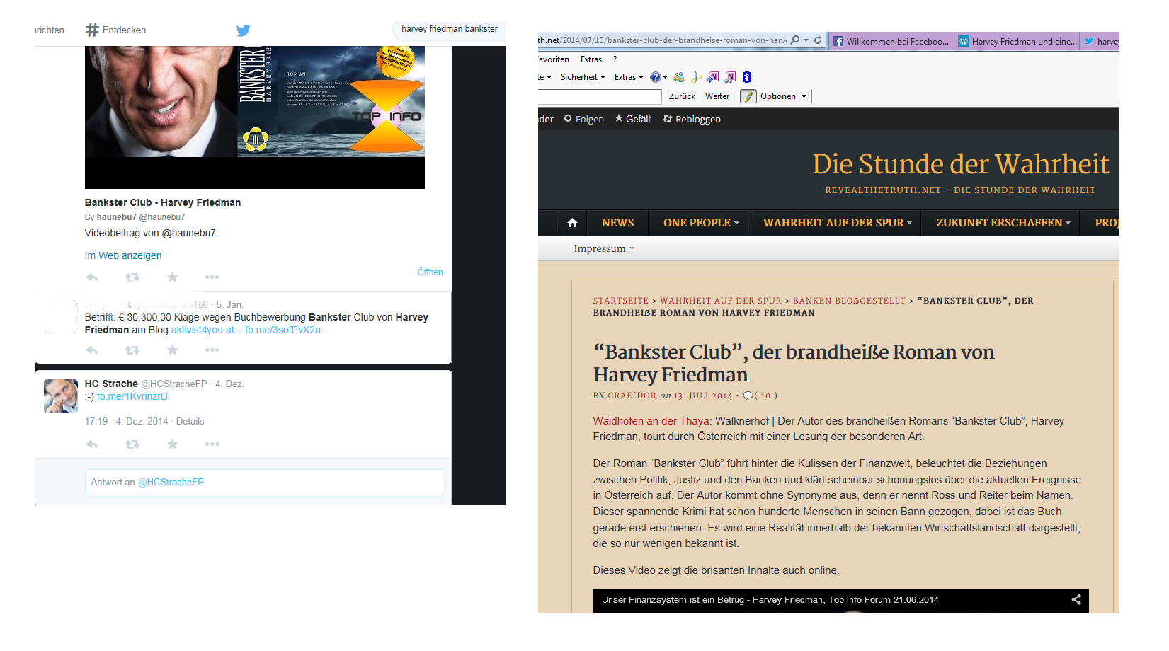 Wie der Collage ebenfalls entnommen werden kann, wird das Buch nicht nur weiterhin beworben, es kann auch leicht weiterhin bestellt werden. Ganz unabhängig, ganz ohne Zutun von Klaus Schreiner. Und der von Harvey Friedman gesponnene Weltzusammenhangsgarn findet eine hohe Verbreitung, wie an den Zahlen der Aufrufe ablesbar ist. Es wird nicht falsch sein, annehmen zu dürfen, daß die österreichische Bank beispielsweise gegen das Unternehmen Youtube oder das Unternehmen Twitter oder das Unternehmen Facebook keine gleichlautende Klage eingebracht hat. Im Angesicht solcher Unternehmen ist halt eine österreichische Bank auch nicht mehr als eine winzige Blockerin, hilflos ausgeliefert, und wer hilflos ausgeliefert ist, findet dann halt einen Blogger, auf den mit Klagen eingedroschen werden kann, um sich nicht mehr so ganz hilflos und so klein zu fühlen und ein paar Muskelchen des Mutes wachsen zu spüren, auch wenn diese mit freiem Auge nicht zu sehen sind, aber mithilfe einer Lupe – oh, wie kräftig … Ob die österreichische Bank jetzt mit leicht geschwollenen Muskeln schon eine Klage etwa gegen He.-Chr. Strache eingebracht hat? Immerhin verlinkte auch dieser, wie die zweite Collage es belegt, verlinkte also der Obmann der FPÖ mit einem Tweet am 4. Dezember 2014 zu einer Besprechung des Buches, zu einer bewerbenden Besprechung auf einer Website, die mit ihm gesinnungsgemäß die Stunde der Wahrheit teilt … Und auf der Plattform des Unternehmens wiederholt es He.-Chr. Strache, findet das Buch „sehr interessant“ … Eine bessere Bewerbung des Buches kann sich Harvey Friedman gar nicht mehr wünschen, und zugleich ist es doch auch die schlechteste Bewerbung, denn die Urteilskraft von He.-Strache ist auf dem Niveau der friedmanschen Welterklärungswut … Aber nicht nur He.-Chr. Strache hat viel dafür über, auch sein Stellvertreter Norbert Hofer kann derartigen Produkten recht viel abgewinnen, wie beispielsweise Chemtrails …