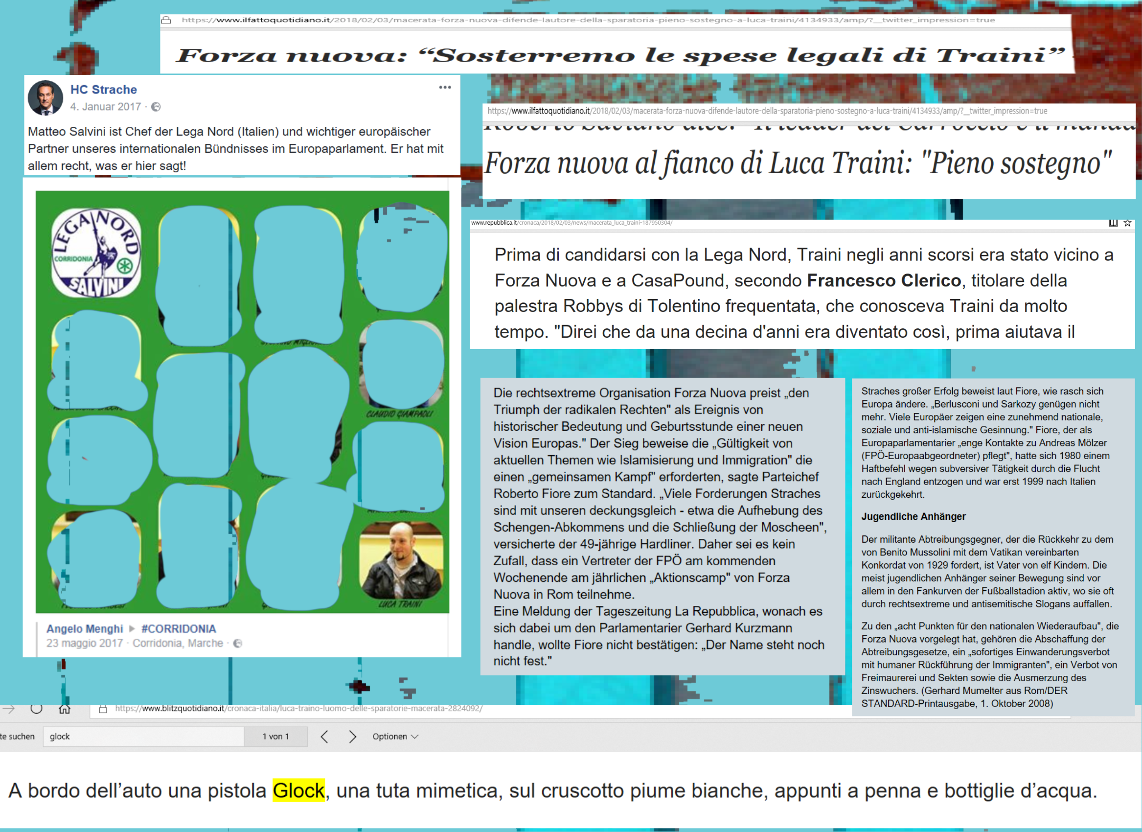Kontakt der schießende Lega-Nord-Kandidat auch zu Casa Pound … Besonders in Erinnerung die Frage des Interviewers der mölzerischen ZZ an einen Vertreter der Casa Pound nach dem „Wiederbeleben des Faschismus“ …