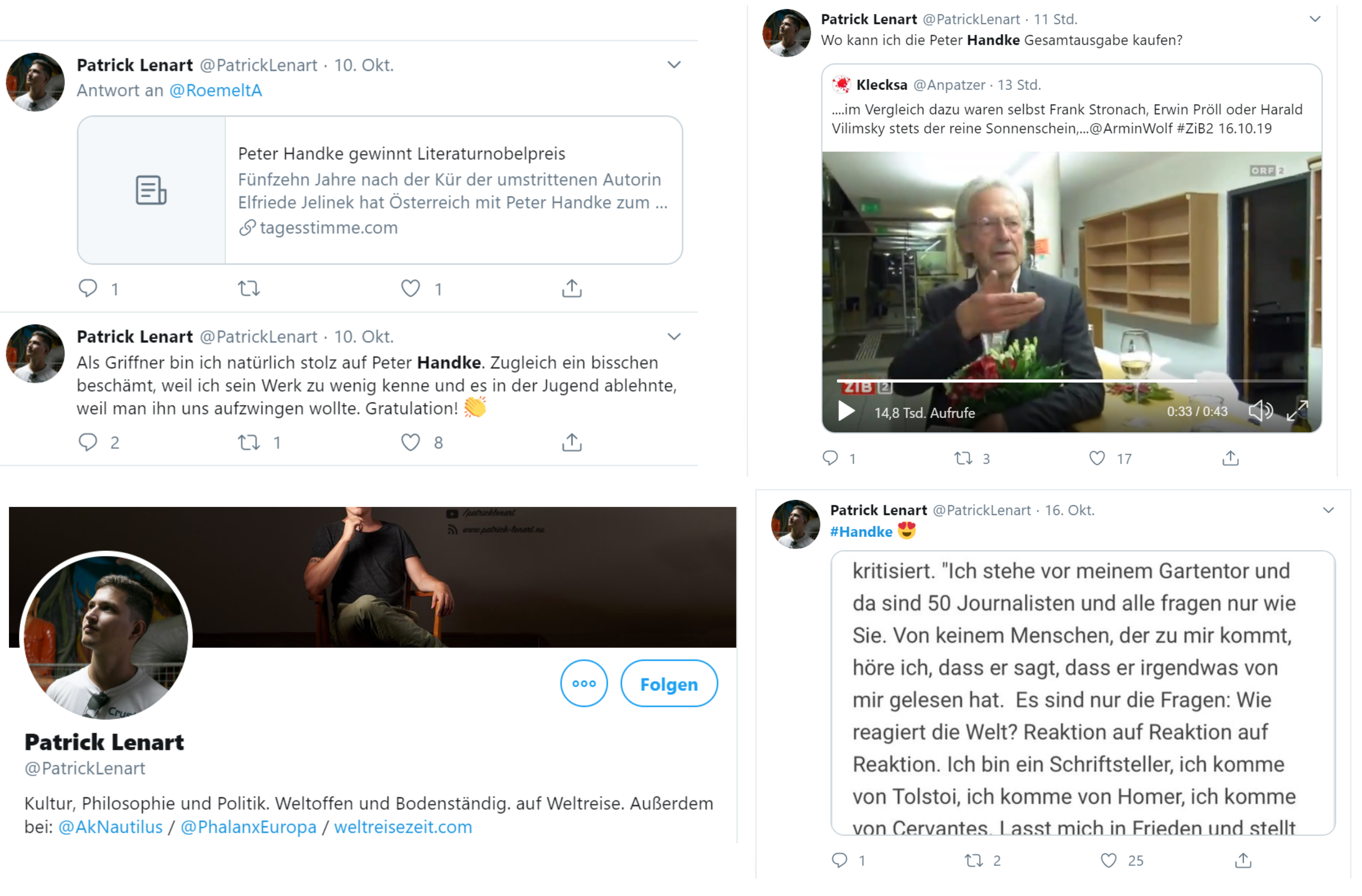 Aber es gibt einen jungen Mann, vielleicht gibt es noch weitere junge Männer, in Griffen, von dem einen jungen Mann jedenfalls kann erzählt werden, von dem jungen Mann aus Griffen, der jetzt wohl recht gespannt auf Interviews von ihm, Handke, warten wird, der jetzt auf der Suche nach der Gesamtausgabe von Handke ist, der auch in seiner Wirklichkeit mit der Wirklichkeit jenseits seiner Wirklichkeit hadert, der jetzt wohl nicht abgeneigt ist, in das Poesieheim Serbien nahe Paris gar zu reisen, um mit ihm, Handke, gemeinsam in die Wälder zu gehen, ihm, Handke, alle seine Bücher auswendig aufzusagen, während er, Handke, Pilze …