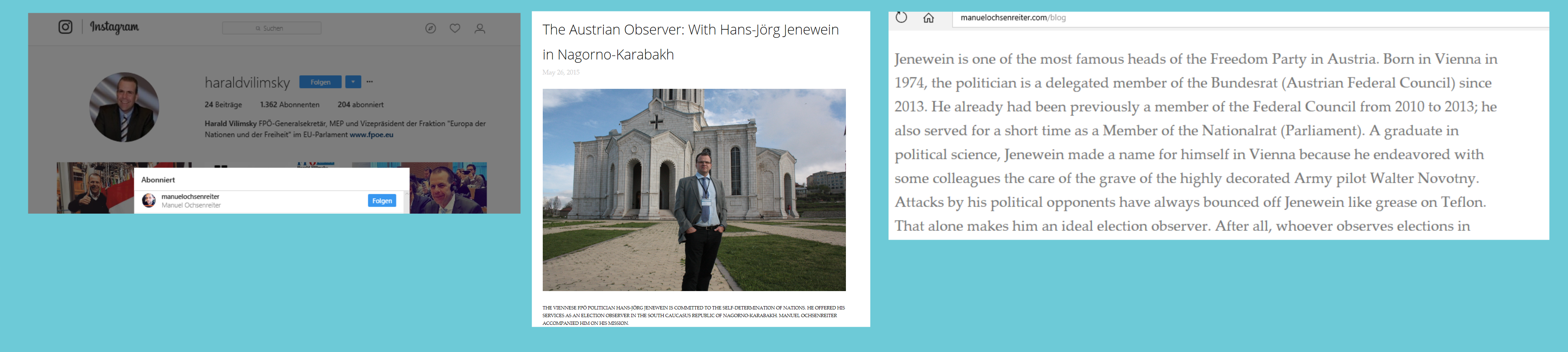 „Jenewein ist einer der berühmtesten Köpfe der Freiheitspartei in Österreich. Der 1974 in Wien geborene Politiker ist seit 2013 delegiertes Mitglied des Bundesrates. Er war bereits von 2010 bis 2013 Mitglied des Bundesrates; Er diente auch kurze Zeit als Mitglied des Nationalrats (Parlament). Der promovierte Politikwissenschaftler machte sich in Wien einen Namen, weil er sich mit einigen Kollegen um das Grab des hochdekorierten Heerespiloten Walter Novotny bemühte.“