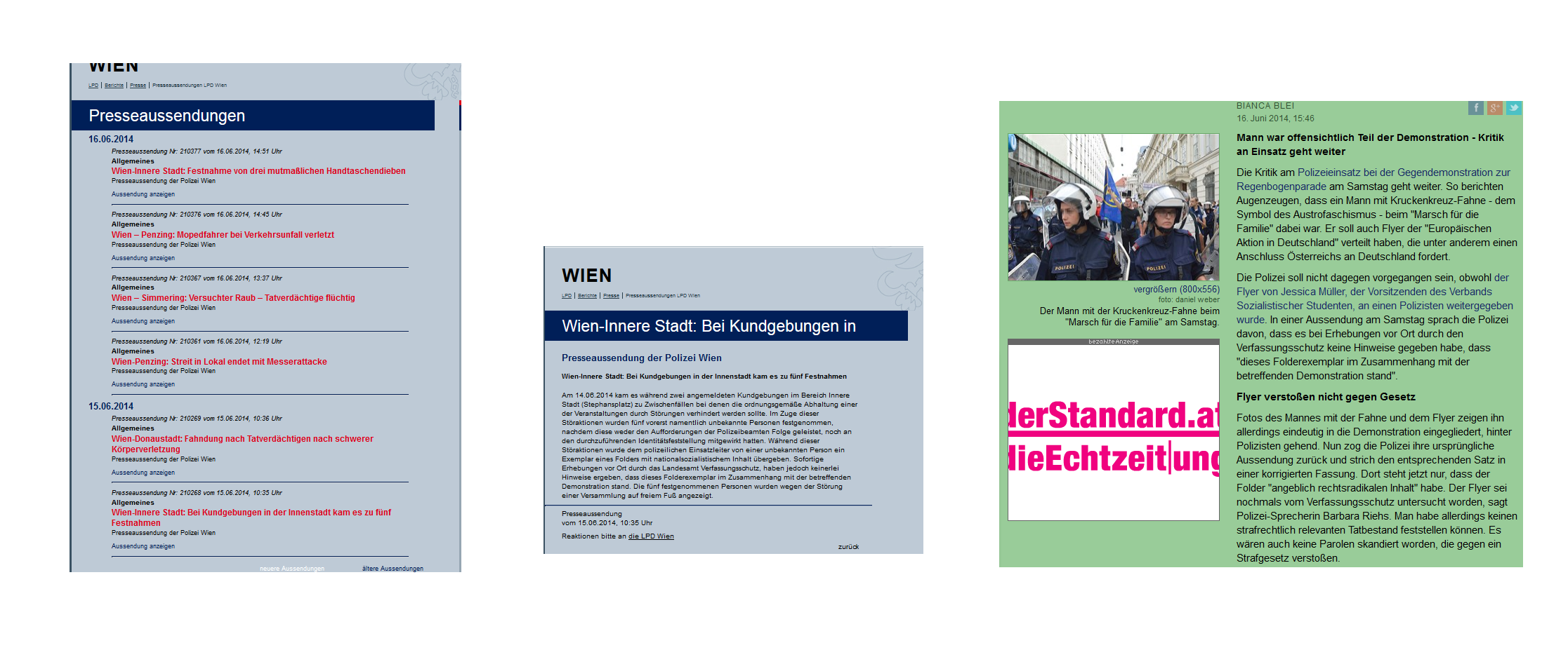 Von der Polizei-Website dürfte die Journalistin diese Auskunft nicht selbst abgerufen haben. Denn dort ist auch heute noch, 16. Juni 2014, 20.18 Uhr, die ursprüngliche Presseaussendung zu finden, über die gestern ausführlich geschrieben wurde, also jene mit der Formulierung „mit nationalsozialistischem Inhalt“. Wie in der Collage gesehen werden kann, ist keine veränderte Presseaussendung für gestern und heute angeführt. Möglicherweise wurde die korrigierte Fassung der Presseaussendung vom Verfassungsschutz veröffentlicht, und beim Verfassungsschutz ist alles geheim, also unauffindbar.