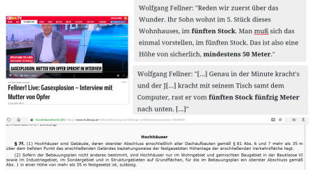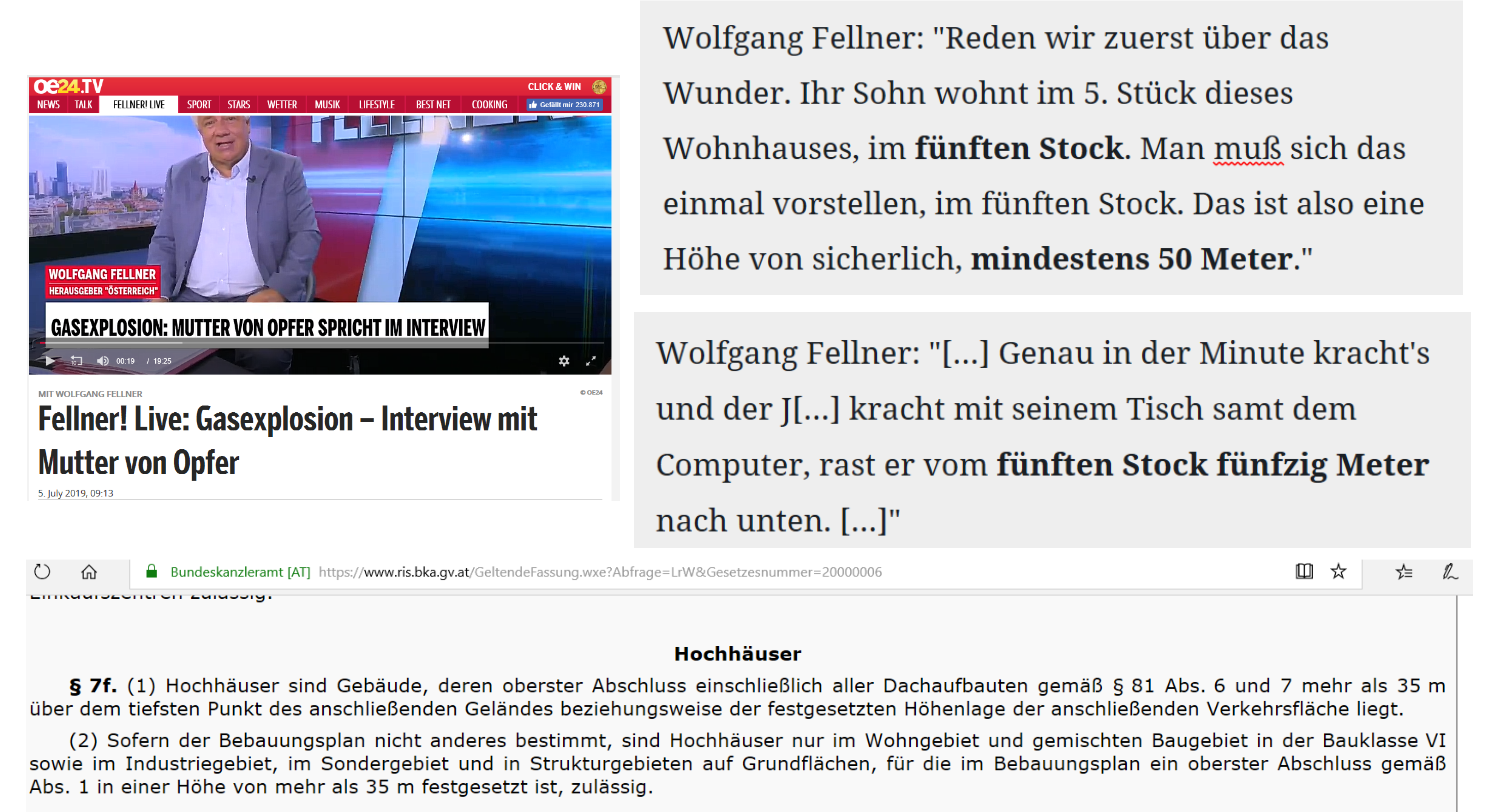 Damit hat Wolfgang Fellner nicht nur wieder einmal bewiesen, seine Qualität als Journalist, sondern auch, daß er, Fellner, der Aufdecker Europas ist. Denn. Er, Fellner, hat nicht nur aufgedeckt, daß Wohnungen in diesem Gemeindebau in der Preßgasse eine Raumhöhe von mindestens 10 Metern haben, er hat auch aufgedeckt, daß durch die Gasexplosion in Wahrheit ein Hochhaus teilweise zum Einsturz gebracht wurde. Denn nach der Bauordnung gilt ein Haus ab fünfunddreißig Metern als Hochhaus.