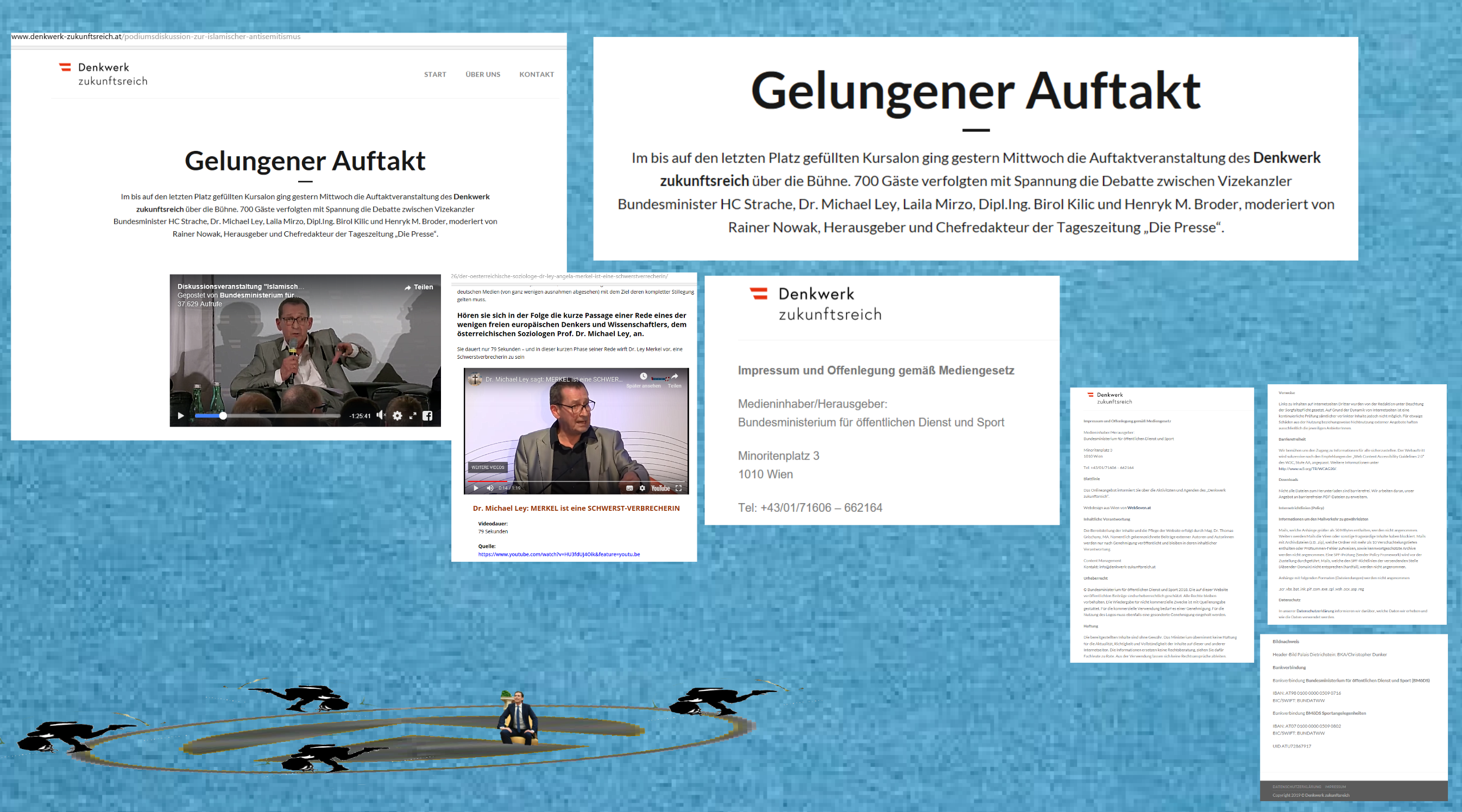 Gesehen wurde Henryk M. Broder. Daß mit ihm der Reigen der Zukunftsreichen eröffnet wird, ist nicht dem geschuldet, daß er eingeladen war als Diskutant auf das Podium, sondern seinem prüfenden Blick der Tafel hinter sich, weil er sich wohl wieder und wieder überzeugen muß, tatsächlich geladener Gast vom „Bundesministerium Öffentlicher Dienst und Sport“ zu sein. Eine Einladung, die er sich vielleicht wünscht, nicht erst seit kurzem, in Deutschland zu bekommen? Vielleicht, weil er angestrengt eine Verbindung versucht herzustellen, zwischen Sport und dem Podiumsdiskussionsthema „Islamischer Antisemitismus“, zum dem er, ausgewählt recht ganz nach dem Leitsatz des Ministeriums öffentlicher Sportdienst, das im Impressum des Denkwerkes als Herausgeber und Medieninhaber geführt wird, eingeladen wurde zu sprechen: „faktenbasiert und expertengestützt“ …