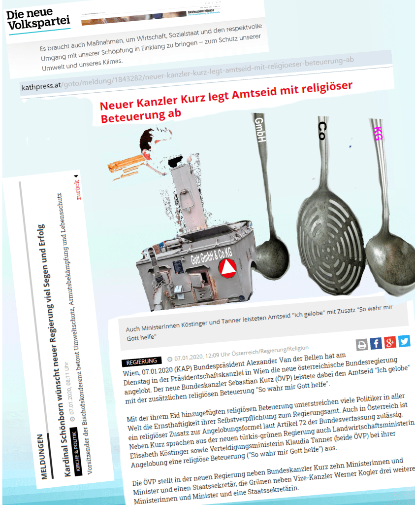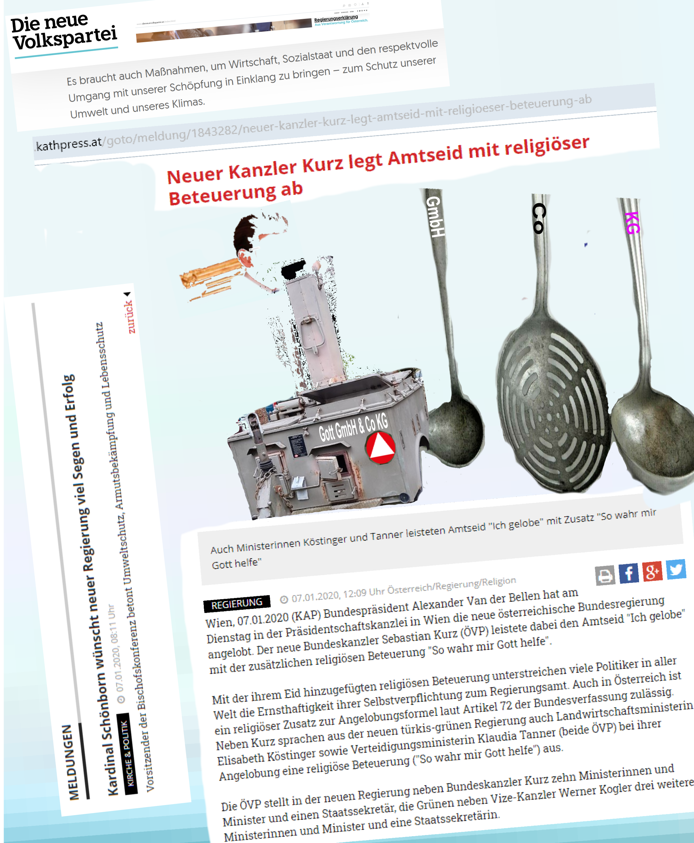 Mit der Angelobung der Bundesregierung in Österreich am letzten Dienstag aber fand das Grübeln erst ein Ende, mit der Fürbitte von Kurz, Köstinger und Tanner, „Gott“ möge ihnen helfen. Mit einem Male war alles verständlich, alles aufgeklärt. „Gott“, so klärte es sich einfach wie kurz auf, ist die Kurzbezeichnung von Gott GmbH. & Co. KG, die den Schöpfer, von dem Schönborn sprach, herstellt, zum Ausschenken von Suppen, Gulasch, kurzum ein Besteck, um Geschenke aller Flüssigkeitsart zu verteilen …