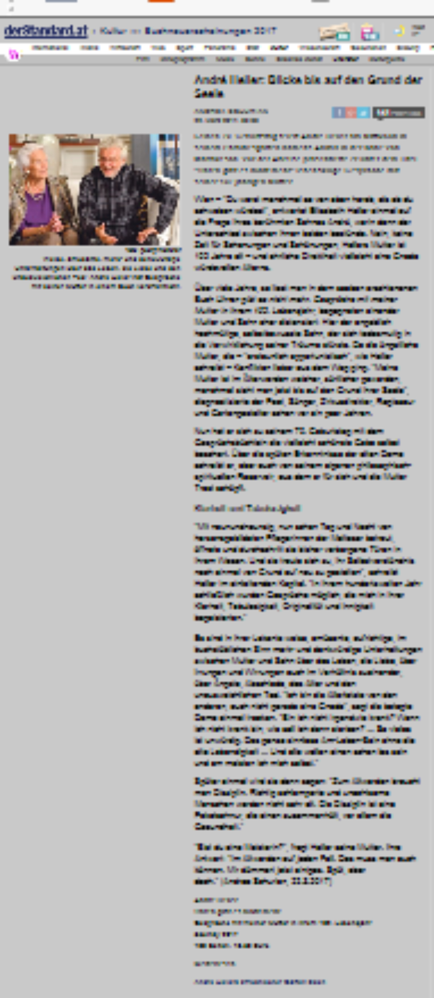AAndrea Schurian - Andre Heller - Blicke bis auf den Grund der Seelech, wäre bloß Andrea Schurian an diesem Nachmittag anwesend gewesen, wie schnell wäre dieses sich in die Länge ziehende Gespräch beendet gewesen, die Verwechslung aufgeklärt. Denn. Der blinde Mensch hält viel auf ihr Urteil. Ihr Artikel in der besten Tageszeitung des Landes war es schließlich auch, der ihn zum Kauf veranlaßte. Sie werden jetzt vielleicht denken, die Zeitung gibt es in Blindenschrift. Nein, es ist die Reinigungskraft, die ihm täglich, ehe sie mit dem Staubwischen beginnt, aus dieser vorliest. Den Tonträger mit dem Gespräch zwischen Herrn Turrini und dem Nachbarskind erwarb er einige Tage zuvor, aufgrund einer Empfehlung vom besten Radiosender dieses Landes. Die Reinigungskraft muß ihm nicht jeden Artikel vorlesen, aber sie hat den Auftrag, ihm unbedingt alle von Andrea Schurian vorzulesen. Und auch der Artikel von ihr über André Heller und Uhren, die es nicht mehr gibt, aber zu tragen sind, verfehlte bei ihm nicht seine Wirkung, von einer Qualität, poetisch, wie der blinde Mensch sagt, als würde André Heller selbst … todesmutig stürze sie sich in die Sprache, wie eben nur eine Meisterin, die über einen Meister … und der Meister werde die Meisterin nicht wie seine Mutter fragen müssen, ob sie eine Meisterin sei, sondern ausrufen: sie ist eine Meisterin! Denn auch das werde er wissen, wie er so vieles wisse, was zum Beispiel Gott sei, auch das wisse er, der Franzi, wie ihn, ist zu lesen, seine Mutter …. von der der blinde Mensch auch heute wieder meint, beim Abspielen des Gespräches zu Topfenstrudel mit Schlag und Tee, sie habe so eine …