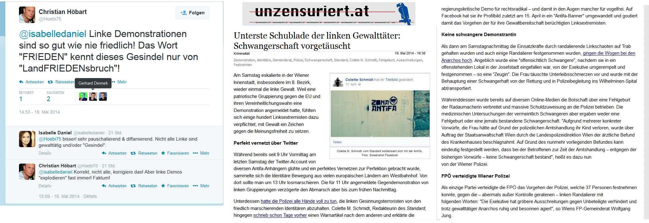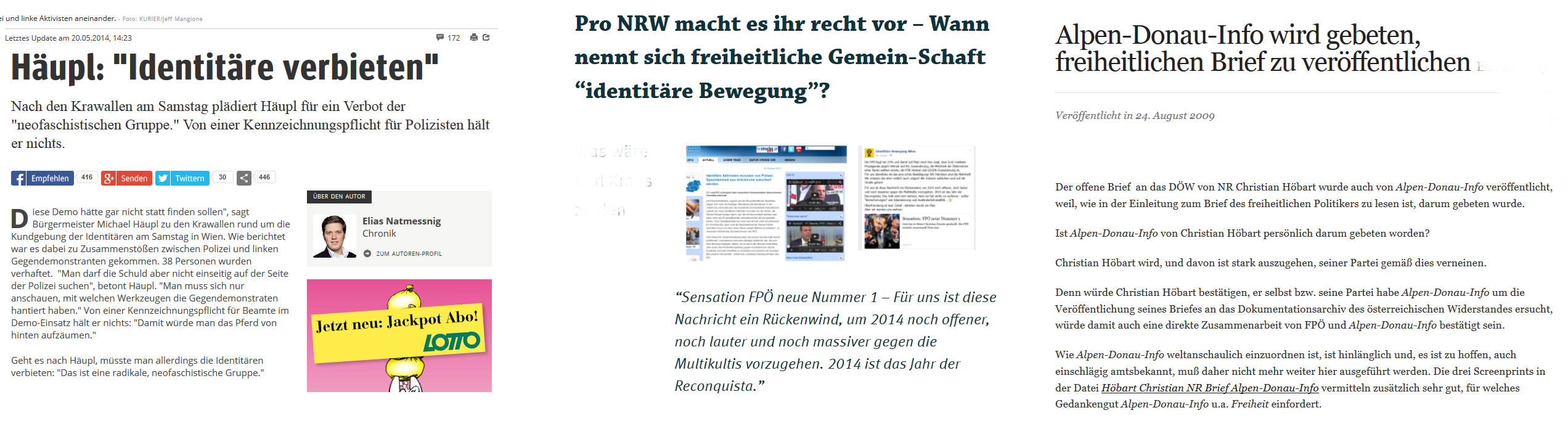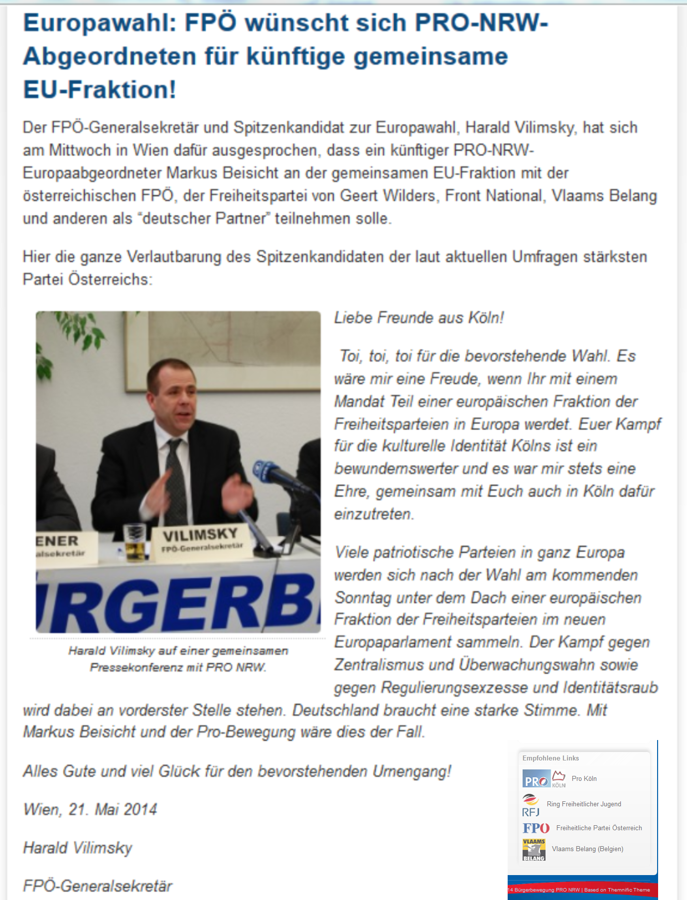 von einer „Elite“, von einer „Umvolkung“, hingegen kann konkret benannt werden, wer die Demonstration in Köln am 26. Oktober 2014 angemeldet hat. Es war ein stellvertretender Vorsitzender der Pro NRW, für die sich die identitäre Gemein-Schaft seit langem recht stark macht, vorneweg Harald Vilimsky …