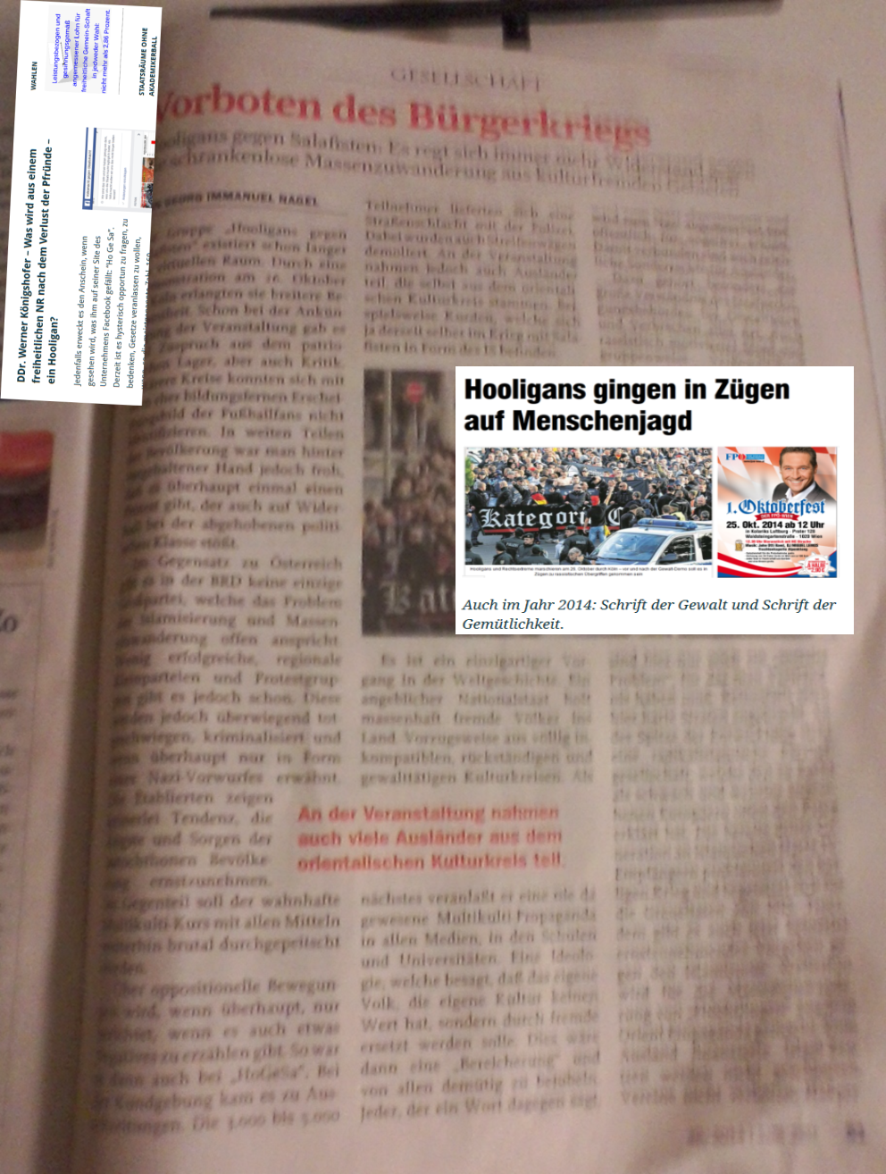Es muß eigentlich nicht viel darüber geschrieben werden. Wer tatsächlich „wieder hinaus auf die Straße will“, darüber wurde im bereits im August 2014 geschrieben, und was das im Zusammenhang mit der Schlagzeile „Vorboten des Bürgerkriegs“ von Georg Immanuel Nagel in der Ausgabe 46 vom 17. November 2014 der ZZ der identitären Gemein-Schaft …