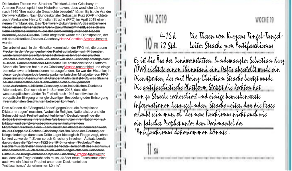 Ehe es ein Aufheulen gibt, das stimme nicht, das sei so nie gesagt worden, im ORF, von Clarissa Stadler, es gäbe auch keine Ausstellung von Kurz, in der er mit Österreich abrechne, gleich zu Beginn deshalb die Wiedergabe des Originals vom Montag, 6. Mai 19, das aber nichts kenntlich machen würde:
