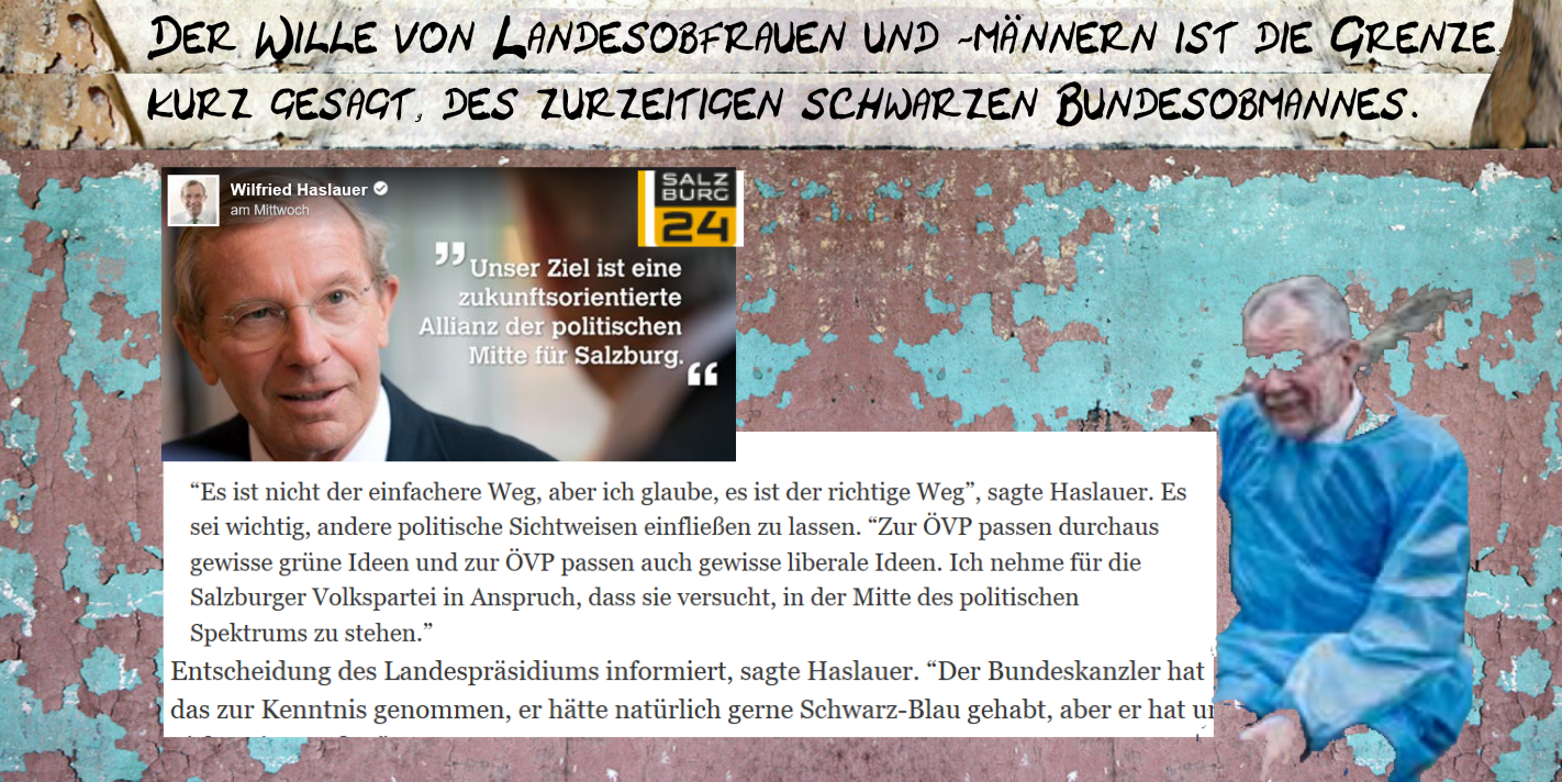 Es muß wohl nicht ausgeführt werden, wofür der zurzeitige Obmann der schwarzen Bundespartei steht. Die Antwort liegt bereits offen im Zitat von Wilfried Haslauer da. Viel hält Wilfried Haslauer, der eine „zukunftsorientierte Allianz“ will, wohl auch nicht von der Orientierungskompetenz der schwarzidentitären Regierung auf Bundesebene, die in der Vergangenheit die Gegenwart sucht, und nicht einmal die Gegenwart findet …