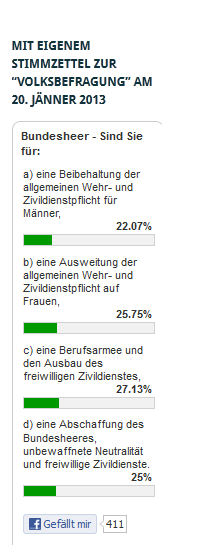 Denn, was sollen die Bürgerinnen und Bürger, die nach heutigem Zwischenstand in dieser Umfrage zu 25,75 Prozent für die Ausweitung der Wehrpflicht und der Zivildienstpflicht auf Frauen votieren, am 20. Jänner 2013 wählen? Möglichkeiten dazu wurden ventiliert unter: Aus der „Volksbefragung“ am 20. Jänner 2013 eine Volksbefragung machen – Ein Vorschlag zur Verbreitung … Das ist, auch nach dem heutigen Zwischenstand der Umfrage, die absolute Mehrheit. Die Regierung erreicht heute wiederum weder eine relative noch eine absolute Mehrheit für ihre Sätze …
