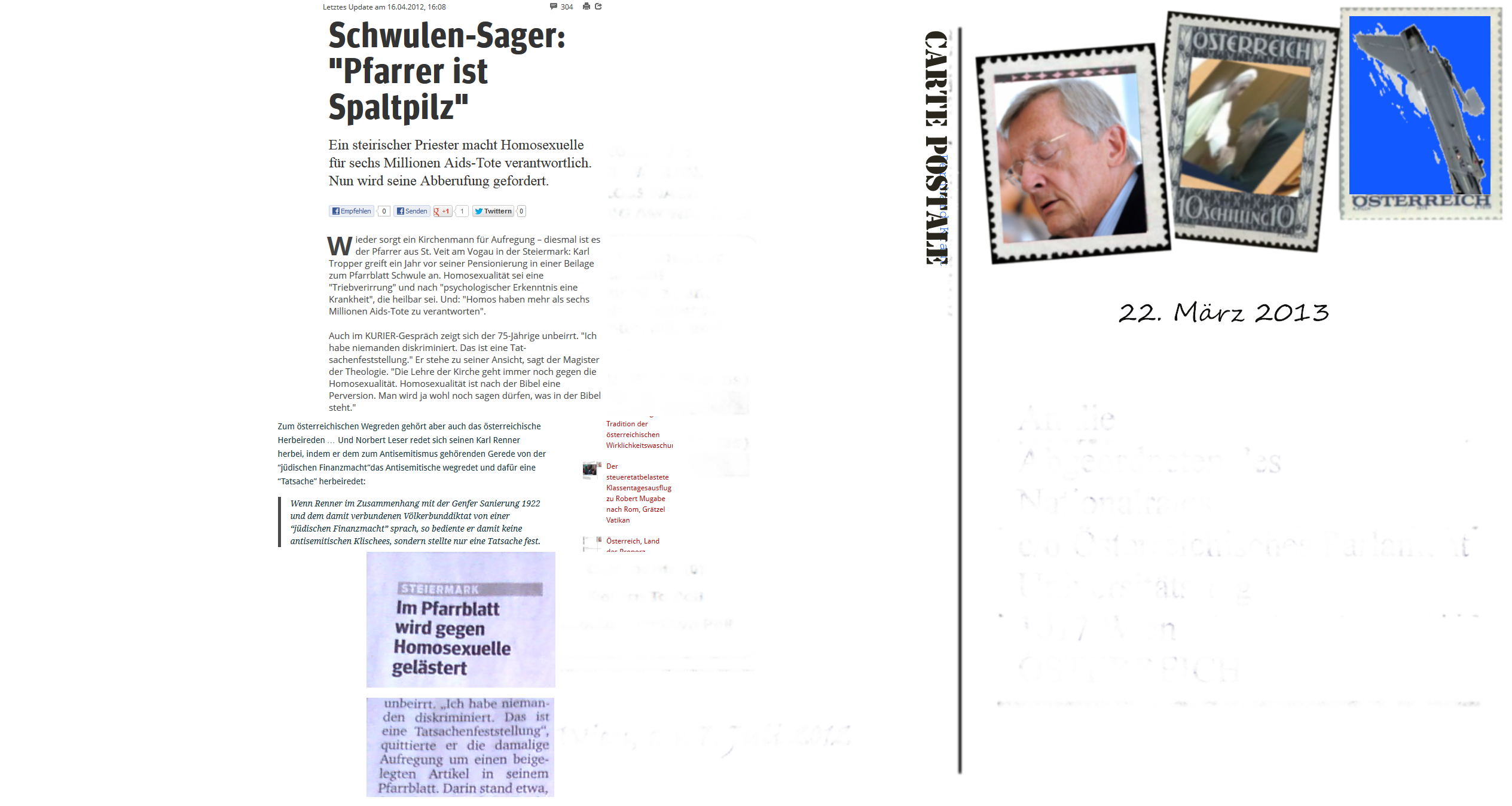 Vorgestern wurde hier über die Anstiftung zur Kunstzerstörung in Österreich von Österreich geschrieben. Anlaß war die Kunstzerstörung in Leibnitz, genauer die Einladung zur Kunstzerstörung von Österreich in Österreich. Und gestern durfte im Arse-Theatre, von dem geglaubt wurde, es sei längst schon geschlossen worden, bei freiem Eintritt einem Stück beigewohnt werden, das von der Kundschaft der österreichischen Qualitätszeitung „Der Standard“ aufgeführt wurde.
