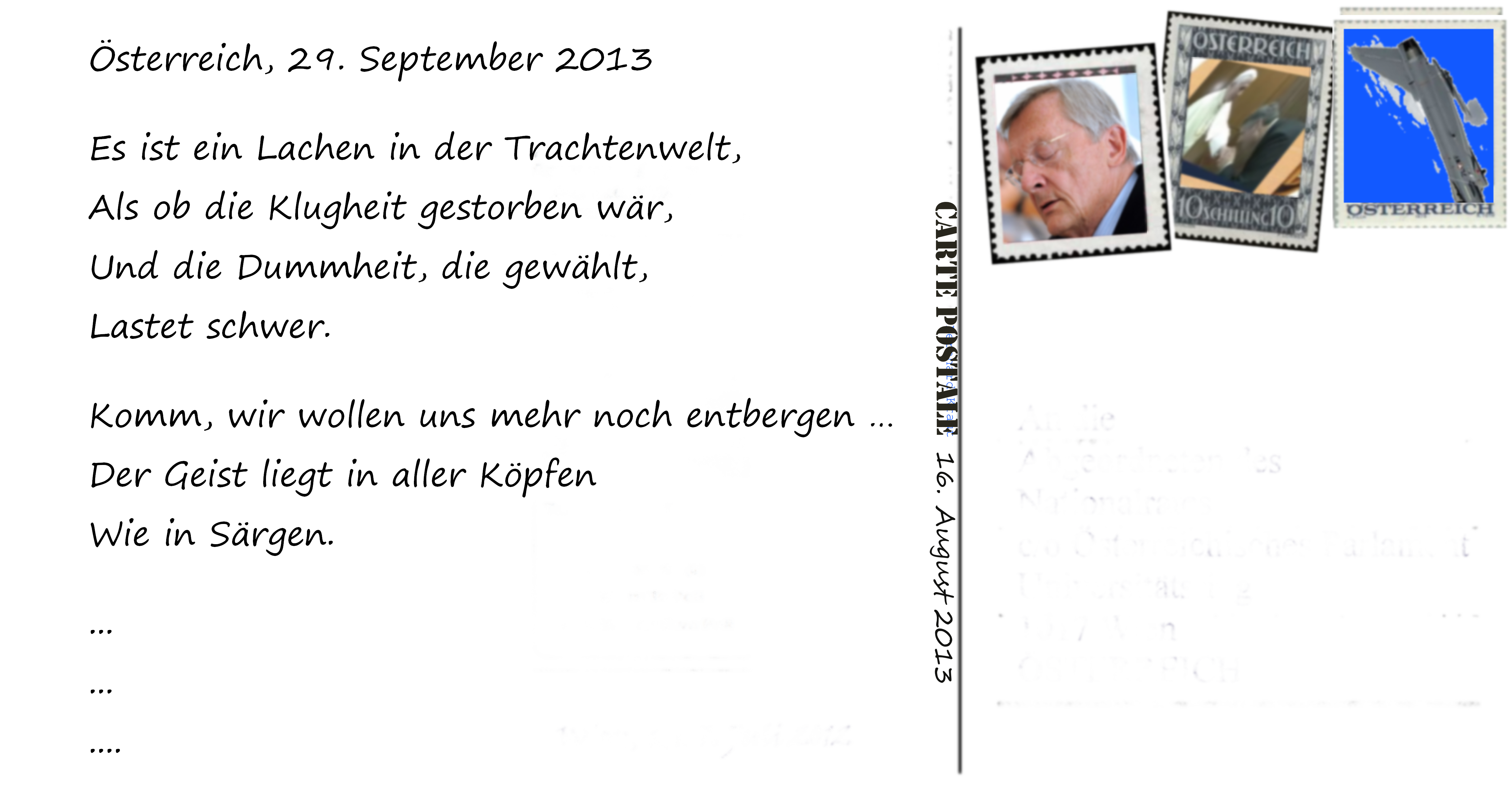 Seine Anteilnahme, schreibt Thomas Glavinic noch im ersten Absatz, am politischen Geschehen in Österreich sei nachhaltig gestört worden, die Freude an österreichischer Politik sei ihm vergangen, weil die Leute, die Wolfgang Schüssel und Jörg Haider dem Land zugemutet … tatsächlich aber zugemutet haben Wählerinnen und Wähler dem Land Jörg Haider und Wolfgang Schüssel. Ob Thomas Glavinic die Freude geblieben wäre, hätte es nur Leute wie Schüssel und Haider gegeben und keine Elisabeth Sickl, keinen Michael Krüger … Thomas Glavinic verwendet die Gegenwartsform, aber in seiner Gegenwart ist es noch nicht angekommen, daß Uwe Scheuch längst schon Vergangenheit ist …