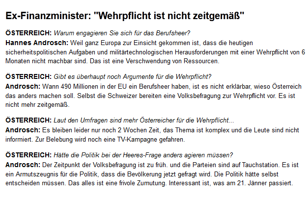Und dem „Herrn“ werden alle weiter und noch mehr mit ihrem Steuergeld zu dienen haben. Das ist entschieden. Hier herrscht Einigkeit in der Regierung von ÖVP und SPÖ. Über den Dienst am „Herrn“ durch Steuergeld hat der Souverän nicht zu entscheiden. Es herrscht also Einigkeit darüber, unabhängig davon, ob die Kugel auf Wehrpflicht oder auf Berufsheer zum Liegen kommen wird, es muß das Haus des „Herrn“ modernisiert und professionalisiert werden … Es wird von Modernisierung und Professionalisierung gesprochen, um das Wort Aufrüstung zu vermeiden. Denn das Wort Aufrüstung würde augenblicklich die Rüstungsindustrie erinnern und augenblicklich erhellen, wer die tatsächliche Nutznießerin ist und wer die tatsächliche Gewinnerin dieser „Volksbefragung“ sein wird. Es wird die Rüstungsindustrie sein, die durch Steuergeld staatlich geschützte Werkstätte, die aber nicht Produkte zum Nutzen des Menschen erzeugt, sondern für den Schrottplatz produziert – weltweit leider nicht so harmlos als im konkreten österreichischen Fall …