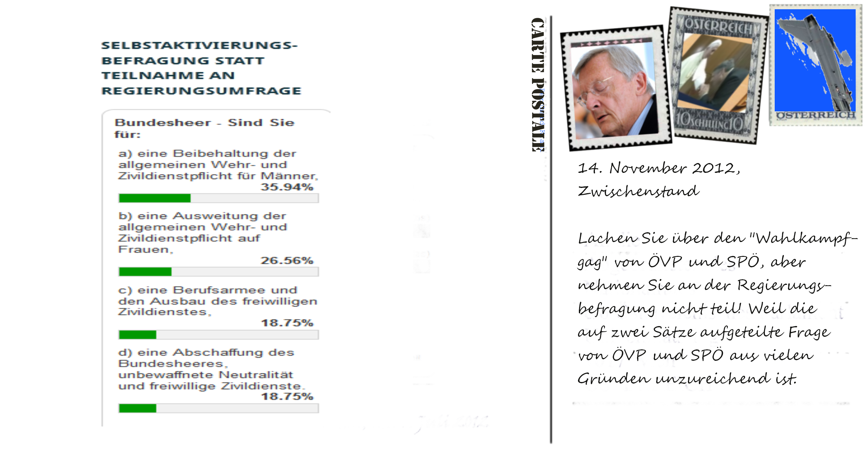 PS Nebenbei oder zusätzlich: einen guten Einblick in die hießige elder-art scene gibt diese Ausgabe von „ErLesen“, abrufbar auf youtube. Mehr will dazu gar nicht geschrieben werden … Außer noch, die Aussage von Erwin Wurm in dieser Sendung fügt sich nahtlos ein in den wurmschen Tauschvorschlag … und die Begründung, der Bundeskanzler solle einmal als Gewerbetreibender arbeiten, damit er sehe, wie es Gewerbetreibenden gehe, wird Frank Stronach wohl abnicken und hinzufügen, is mei copyright – Wirtschaft, understud …
