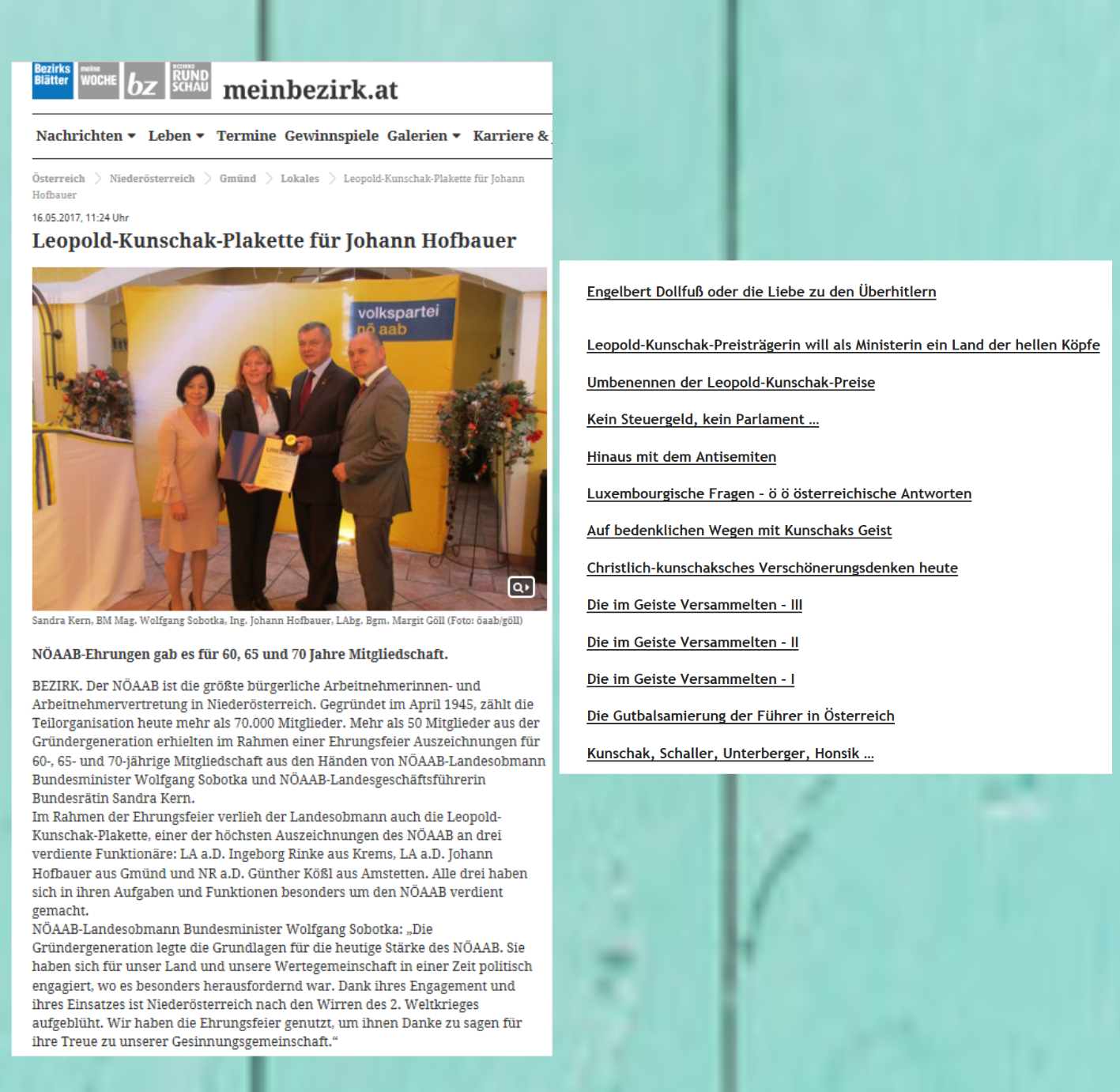 Nun erzählt Wolfgang Sobotka, wie am 31. März 2018 berichtet wird, der ÖAAB Niederösterreich habe beispielsweise bereits reagiert und verleiht anstelle der Leopold-Kunschak-Plakette eine Alois-Mock-Plakette …