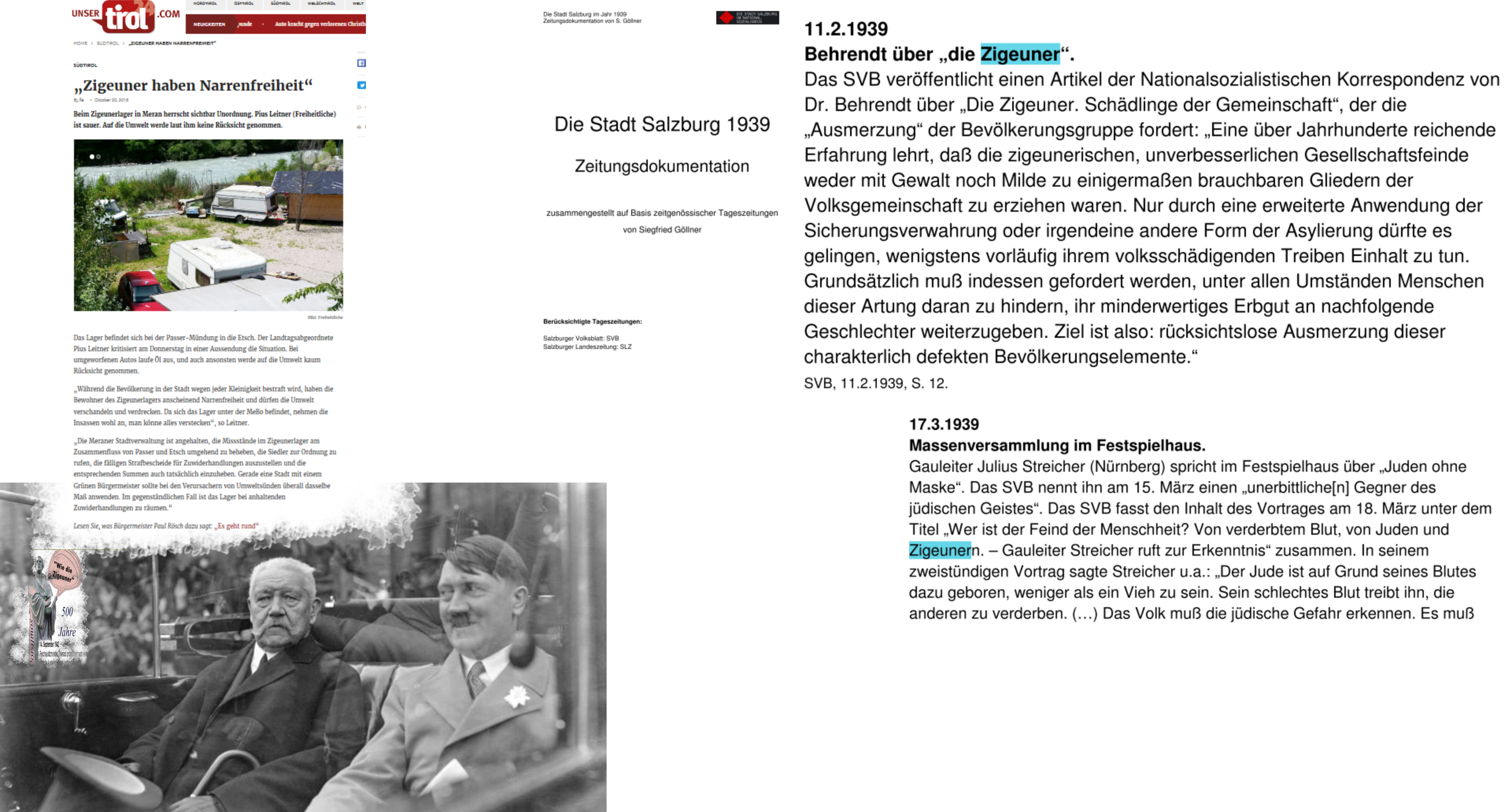 Wenn von „Rumänen“ gesprochen wird, gerade im Zusammenhang mit dem Betteln, sind „Zigeuner“ gemeint, und „Zigeuner“ im lutherischen Sinne seit fünfhundert Jahren … Ein weiteres Indiz dafür: Es heißt, Täterinnen kehren stets an ihren Tatort zurück. Auch in diesem Fall ist es nicht anders. Wie in der Collage gelesen werden kann, war der „Tatort“ auch in der Vergangenheit ein Tatort des Antiziganismus, Antiromaismus. Damals mußte noch von Roma und Sinti gesprochen werden. Inzwischen reicht es von „Rumänen“ zu sprechen, wenn Roma und Sinti gemeint werden wollen. Na ja, ganz ohne Hinweise geht es doch nicht, um sicher zu gehen, daß auch alle wissen, wer gemeint ist, das läßt sich auch bildlich arrangieren …