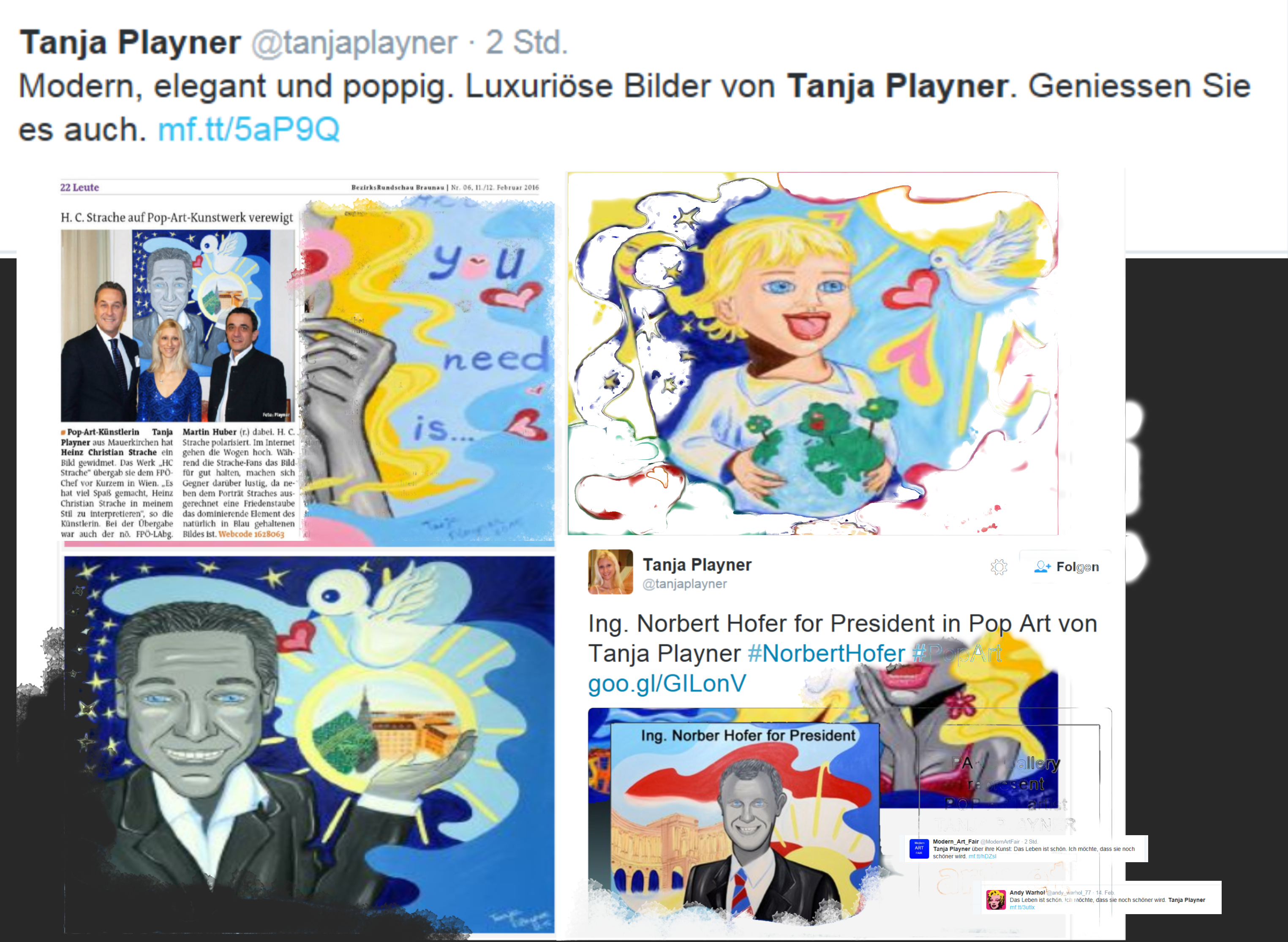 Und mit dieser ihrer eigenen Einschätzung ist es augenblicklich zu verstehen, ihre Hinwendung zu Norbert Hofer und somit zur FPÖ. Denn welche andere Partei verkörpert durch ihre Gesinnung so genau die Kunst von Tanja Playner: modern, elegant, poppig und vor allem luxuriöse …