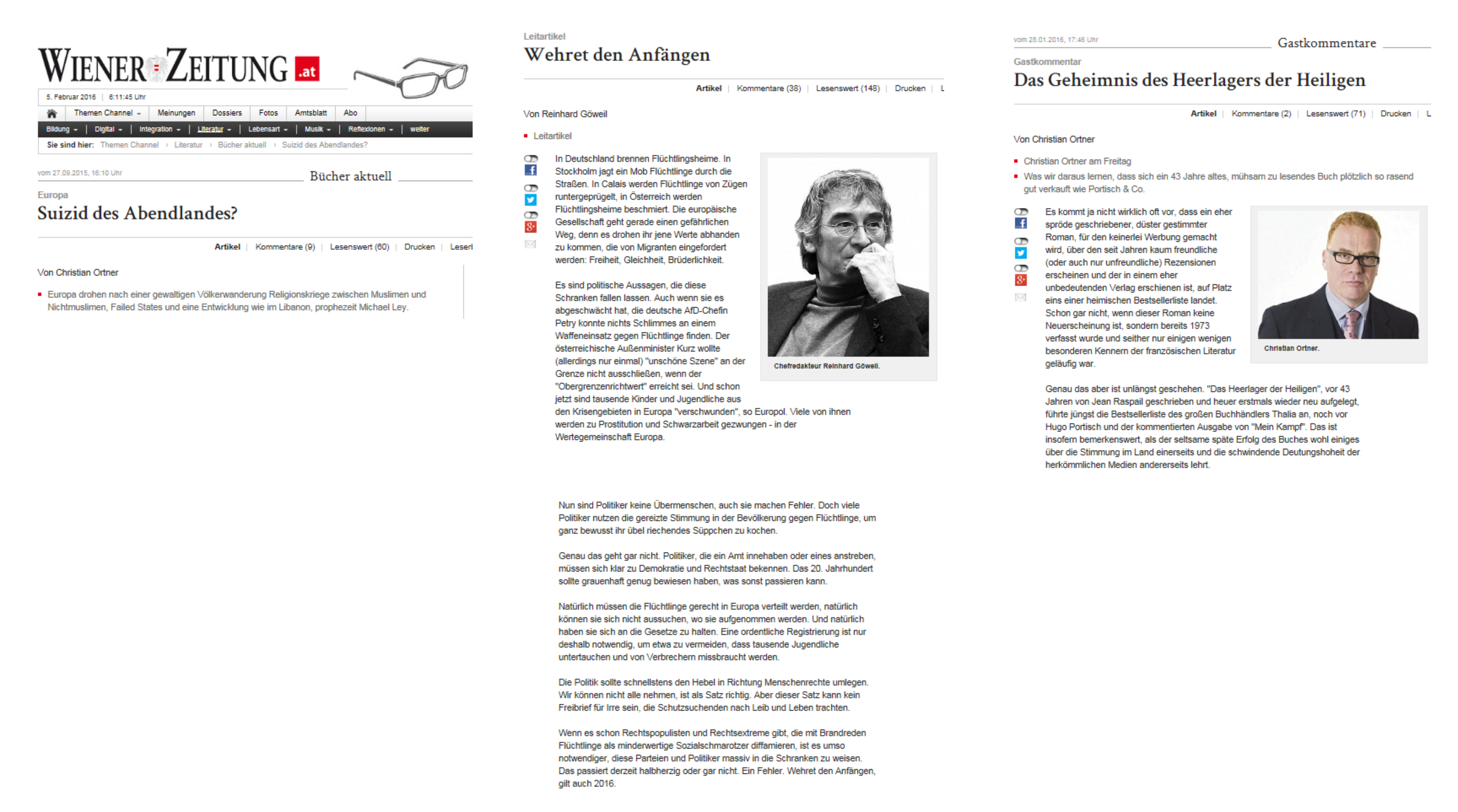 Was für ein göweilsches Plädoyer dafür, daß sich die Politik – zwar von ihm unausgesprochen – ein Beispiel nehmen möge an den Medien, vor allem die österreichischen Medien sich zum leuchtenden Vorbild zu nehmen. Im allgemeinen. Und im besonderen die Wiener Zeitung“, in der wenige Tage vor dem 2. Februar 2016 Christian Ortner so eindrücklich bewiesen hat, im „Heerlager der Heiligen“ zu stehen, mit einem Buch, das derzeit als der Koran der in Österreich nicht gebenden Rechts…
